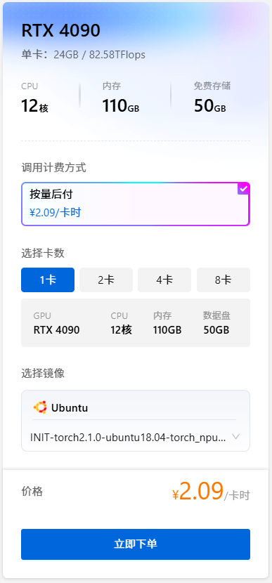 点击5090或4090卡的图片,在页面的右侧,会显示5090或4090卡的详情,当前支持按照卡时计费,根据实际使用量,先使用后付费。并且支持潮汐定价,每天夜间有10个小时,能够享受半价优惠。根据您的算力需求量,一个容器支持挂载1、2、4、8个5090或4090卡。点击选择镜像的下拉菜单,可以选择预装的操作系统和开发框架。然后点击申请资源。